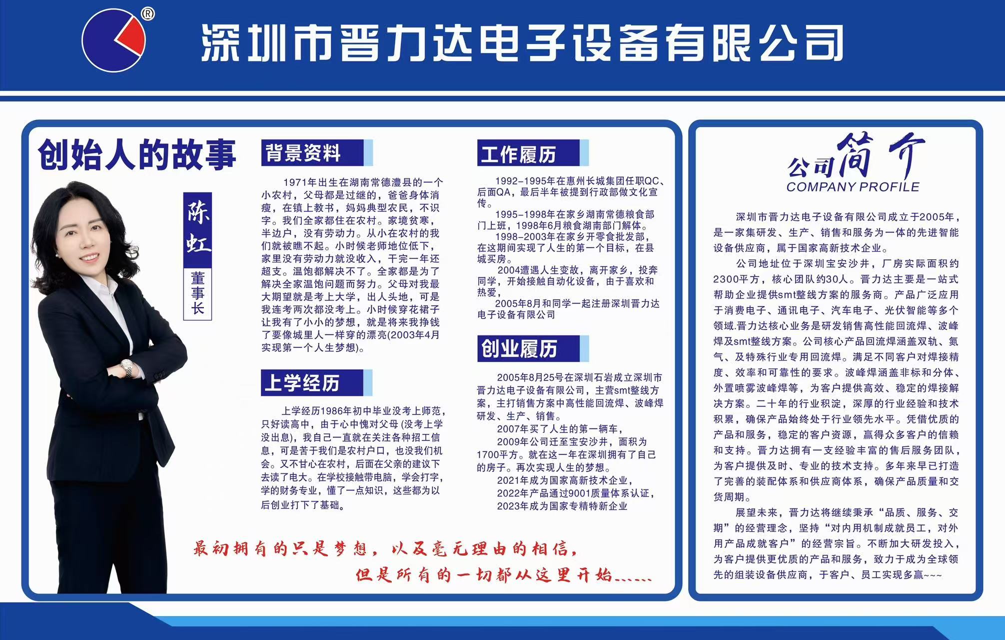 深圳市晉力達電子設(shè)備有限公司成立于2005年,主要從事高性能環(huán)保無鉛回流焊、無鉛波峰焊SMT等周邊設(shè)備的研制開發(fā)、生產(chǎn)銷售為一體的專業(yè)流水線配套生產(chǎn)設(shè)備企業(yè)。優(yōu)良的產(chǎn)品質(zhì)量和 先進的技術(shù)使我們與客戶們建立了良好的關(guān)系,并讓我們在同行業(yè)中擁有良好的聲譽。遵循“誠信、務實、精益、創(chuàng)新、環(huán)?!钡钠髽I(yè)文化,堅持以技術(shù)差異化創(chuàng)造 市場機會,秉承以高技術(shù)、高品質(zhì)、優(yōu)服務為宗旨,堅持國際化、標準化、專業(yè)化的方針,我們將為您提供優(yōu)質(zhì)的設(shè)備和優(yōu)良的服務。我們倡導誠信變通、簡單、高 效、樂觀敬業(yè)的激情創(chuàng)業(yè)文化,我們致力于用技術(shù)為客戶提供更好的體驗和服務,與客戶員工共同成長,實現(xiàn)多贏!