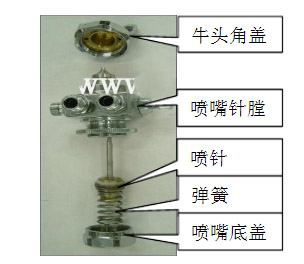 (7)清理干凈后的部件在噴針膠圈位加適量高溫油,將噴針裝入噴針膛內,裝入彈簧蓋上底蓋,再將頂部牛頭角蓋裝上。