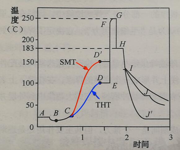 當(dāng)焊接操作開始,操作者將室溫PCBA通過助焊劑涂覆區(qū)時(shí),印制板的溫度接近于助焊劑的液溫,即圖中B點(diǎn)。涂覆了助焊劑的PCB從C點(diǎn)開始進(jìn)入預(yù)熱區(qū),受熱后助焊劑中的溶劑不斷被蒸發(fā),而助焊劑中的固體成分開始分解出能凈化基體金屬的活性物質(zhì),在PCB到達(dá)D點(diǎn)時(shí),達(dá)到預(yù)熱所要求的溫度,這是一般的通孔安裝PCBA預(yù)熱溫度曲線。對(duì)于 SMC/SMD的大量應(yīng)用的PCBA,由于PCB基板材質(zhì)、厚度、層數(shù)、銅箔黏合劑等因素,決定其熱容量的提高,預(yù)熱溫度也隨之提高。預(yù)熱溫度被普遍提高到與焊接溫度的差值小于100℃以內(nèi)的程度,如圖中紅色曲線所示的D'點(diǎn)(150℃左右)。