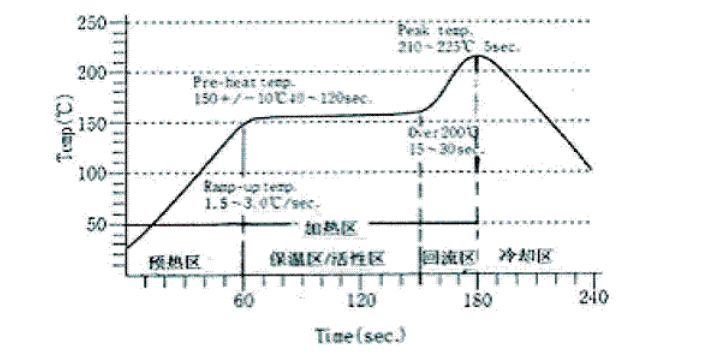 為了加深對(duì)理想的溫度曲線的認(rèn)識(shí),現(xiàn)將各區(qū)的溫度、停留時(shí)間以及焊錫膏在各區(qū)的變化情況,介紹如下:
