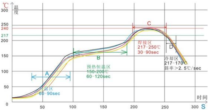 1,分析曲線:首先拿到客戶要求的曲線圖,如果沒有需參照錫膏供應商提供的曲線圖,然后分析其溫度曲線升溫區(qū),恒溫區(qū),焊接區(qū),冷卻區(qū)各個溫區(qū)的峰值及持續(xù)時間。