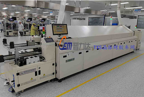 下圖為惠倫晶體重慶分公司TXS晶振烤膠事業部自動上下料機+固化雙軌回流(拍攝照片經由客戶同意)