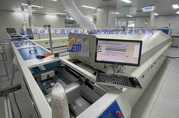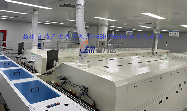 下圖為惠倫晶體重慶分公司自動測試+老化線,實際模擬晶振產品在經過自動上板進入三次回流焊烘烤后產品是否存在可靠性問題,并經由視覺掃碼分選進入后端48H和96H老化爐,出口自動收板,達到客戶晶振每月產能60000K(拍攝照片經由客戶同意)
