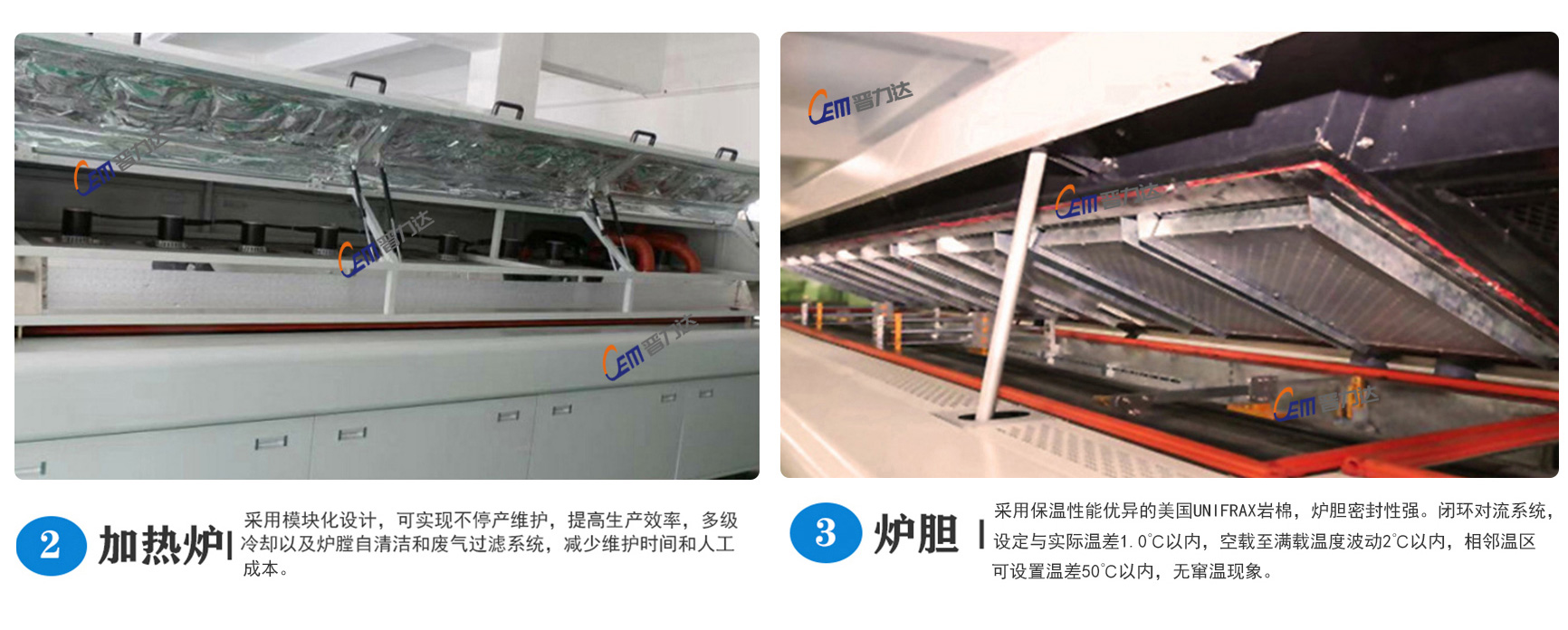 ● 各溫區采用強制獨立循環,獨立PID控制,上下獨立加熱方式,使爐腔溫度準確,均勻,熱容量大;獨特的雙熱風通道加熱方式, 快速熱補償,高制程能力,解決了回流焊焊接時的死角難題.適合CSP、BGA、0201CHIP等電器元件的焊接.